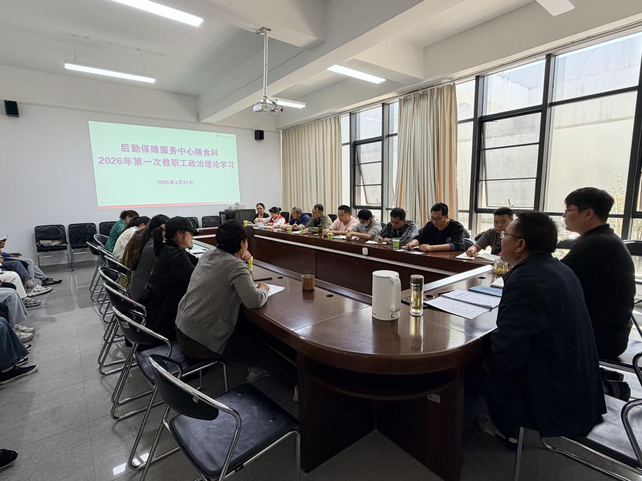 3月31日下午,后勤保障服务中心组织召开2026年3月食品安全风险管控调度会。基本食堂食品安全总监何学凯、食品安全主管刘兰飞、各食堂食品安全员、保管员参加了会议,会议由刘兰飞主持。